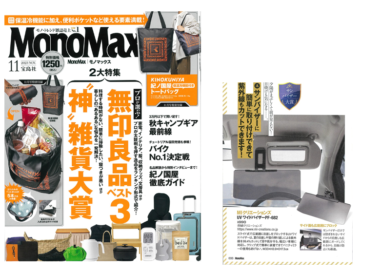 media|2022.05 雑誌に紹介「UV ワイドバイザー」 『MONOMAX』に「UV ワイドバイザー」が神雑貨大賞 サンバイザー部門で「大賞」にえらばれました!! サンバイザーに簡単に取り付けできて、紫外線もカットできます。 UV ワイドバイザー PF-682は、こちら